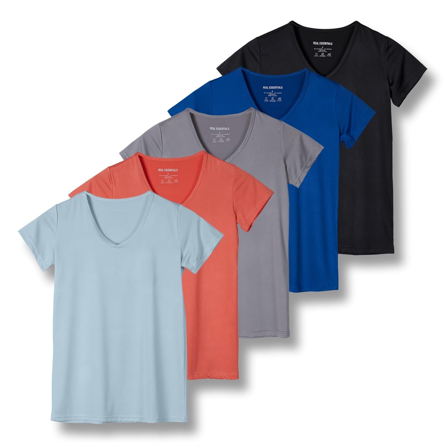 Real Essentials 5 Pack: Women’s Dry Fit Short Sleeve V Neck Workout Top – Fitness Gym Athletic Yoga T-Shirt (Plus Available)